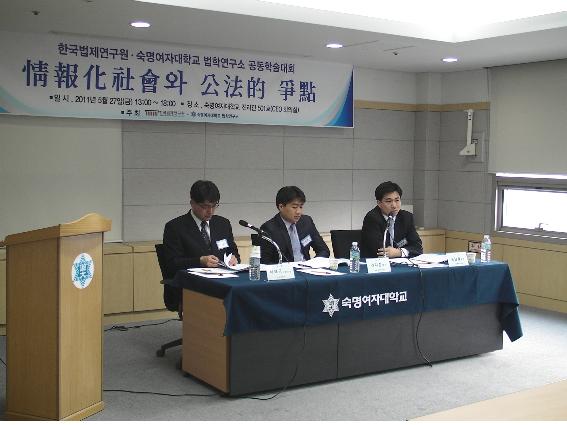 한국법제연구원은 지난 5월 27일(금) 13시 30분에 숙명여대 진리관 501호에서 “정보화 사회와 공법적 쟁점”을 주제로 숙명여대 법학연구소(소장 이욱한)와 한국법제연구원(원장 김기표)와 공동학술대회를 개최하였다.