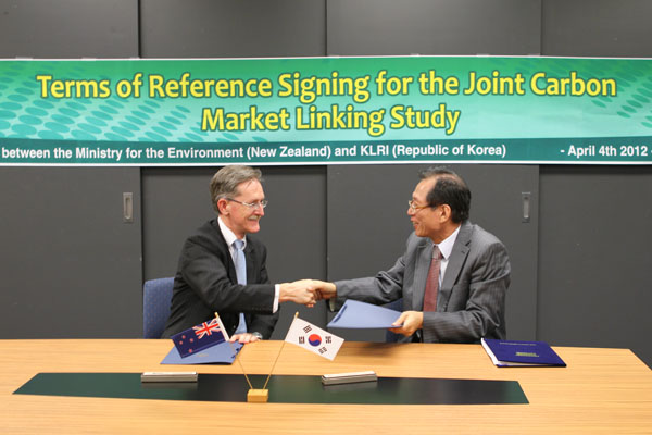 4월 4일 뉴질랜드 환경부(웰링턴 소재)에서 한국법제연구원 연구 본부장 문준조 박사와 뉴질랜드 환경부 부장관 가이 빗슨 (Guy Beatson)과의 공동연구 체결식이 있었다. 한국법제연구원과 뉴질랜드 환경부는 국제탄소시장 통합에 대비한 공동연구를 하기로 합의하고 이에 관하여 TOR(Terms of Reference)를 체결하였다.