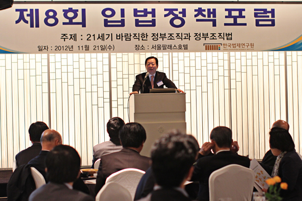 한국법제연구원은 11월 21일 팔래스호텔에서 성낙인 서울대학교 법학전문대학원 교수를 발제자로 초청하여 “21세기 바람직한 정부조직과 정부조직법”을 주제로 제8회 입법정책포럼을 개최하였다.