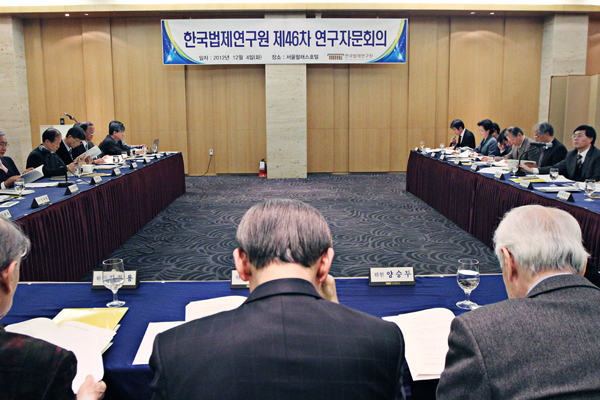 지난 4일, 한국법제연구원 제46차 연구자문위원회가 팔래스호텔 그랜드볼룸에서 열렸다. 이날 30여명의 연구자문위원과 한국법제연구원 원장 및 각 부서장들이 참석한 가운데 최환용 경영기획본부장의 2013년도 사업계획 및 연구사업계획에 대한 보고가 있었다.