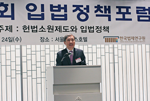 한국법제연구원은 24일 팔래스호텔에서 헌법재판소 강일원 헌법재판관을 발제자로 초청해 “헌법소원제도와 입법정책”을 주제로 제12회 입법정책포럼을 개최하였다. 강일원 재판관은 포럼에서 헌법소원제도 유형 및 현안내용을 중심으로 발제했다.