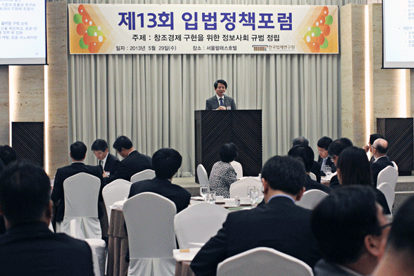 한국법제연구원은 29일 오전7시 팔래스호텔 로열볼룸에서 김동욱 정보통신정책연구원 원장을 발제자로 초청하여 “창조경제 구현을 위한 정보사회 규범정립”을 주제로 제13회 입법정책포럼을 개최했다.
