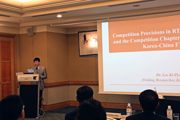 ‘지역무역협정상 경쟁 규정과 한·중 FTA의 경쟁 챕터’(Competition Provisions in RTAs and the Competition Chapter in Korea-China FTA)를 주제로 발제한 이기평 한국법제연구원 초청연구원은 최근 FTA 협상에서 관심이 높아지고 있는 FTA상 경쟁챕터 도입에 대한 국제적인 흐름을 소개하고 한·중 양국의 기체결 FTA상 경쟁챕터에 대한 상세한 비교분석을 통해 한·중 FTA에서 경쟁챕터를 어떻게 규정할 것인지에 대한 방안을 제안하였다.
